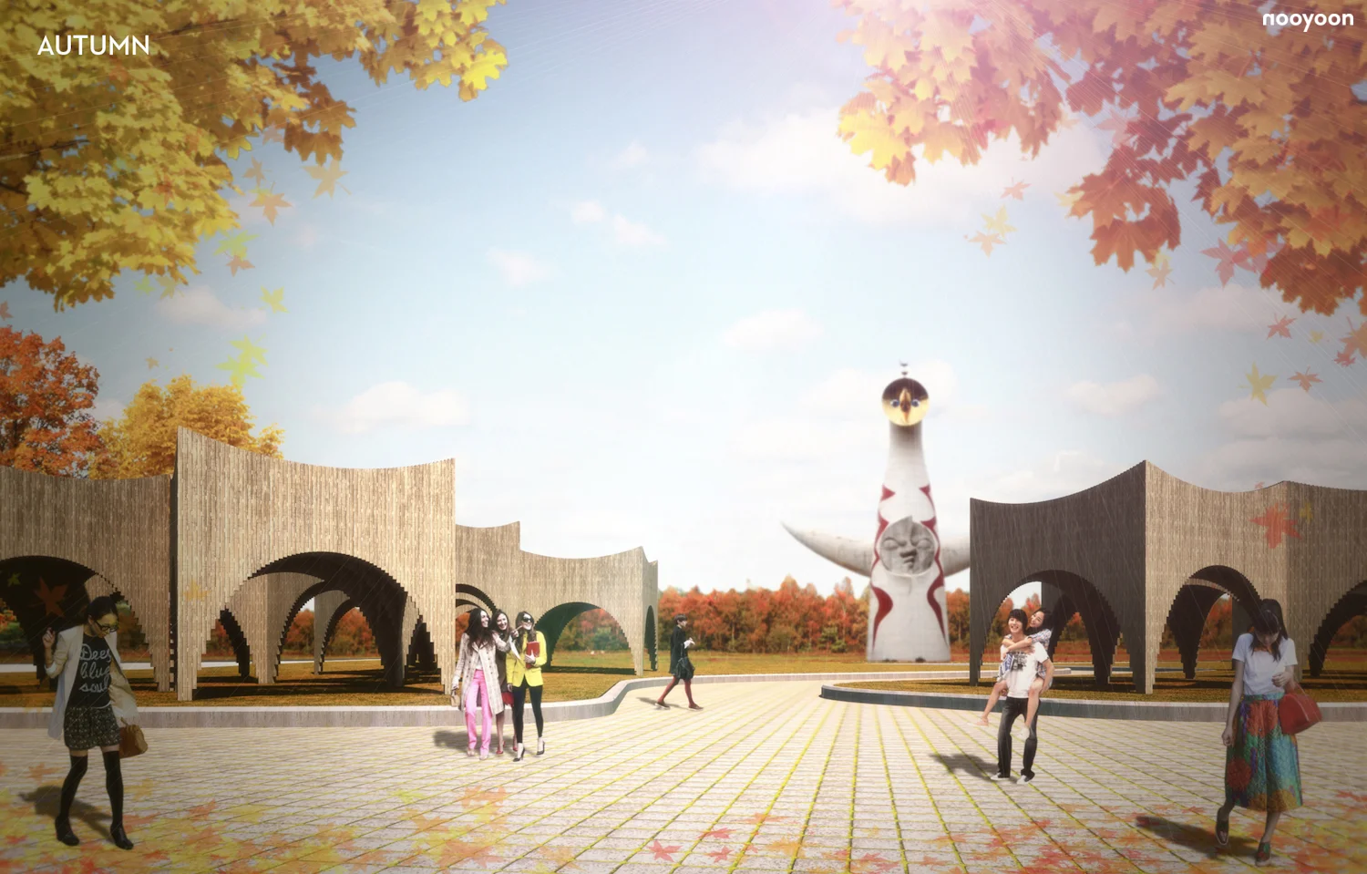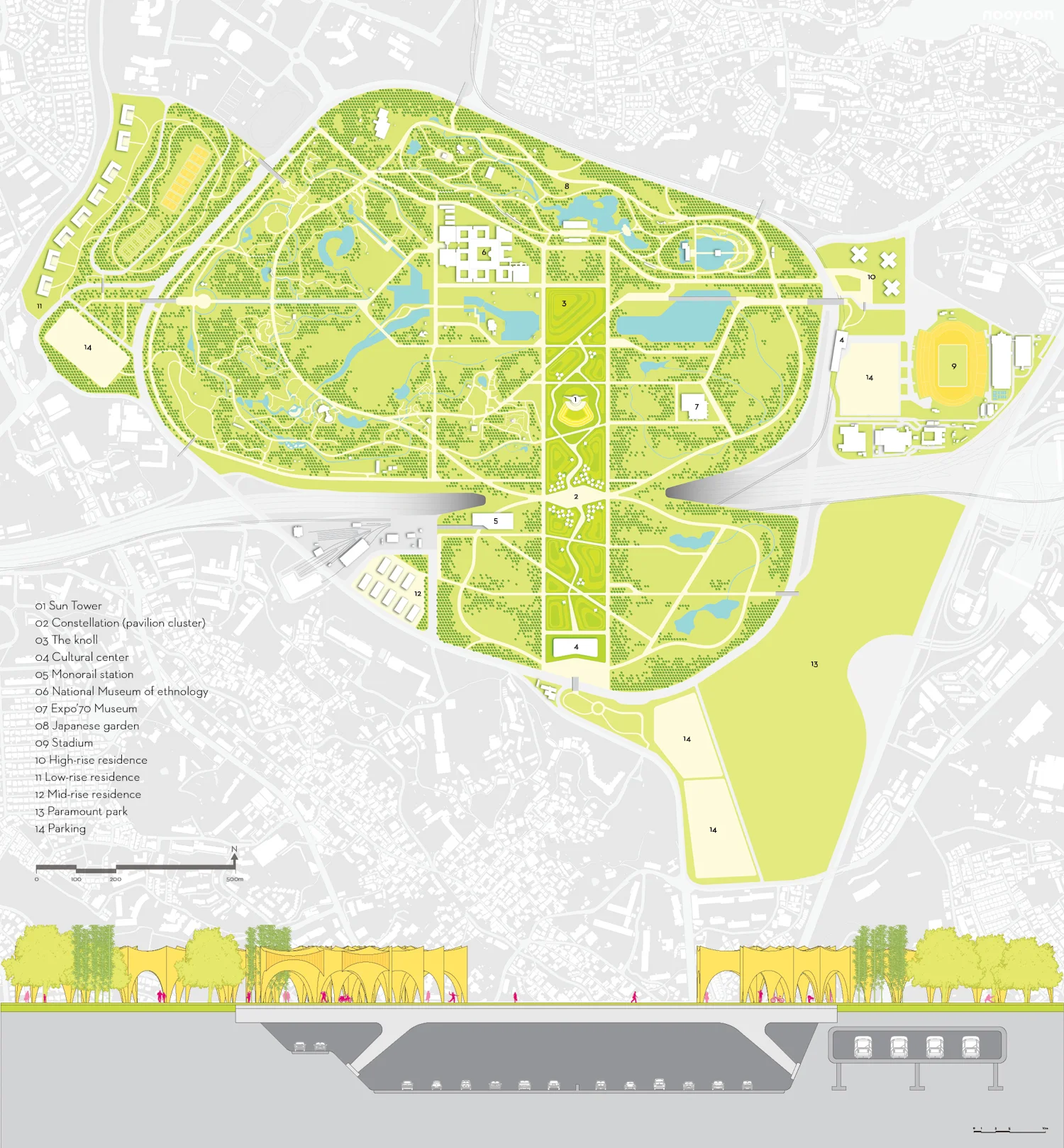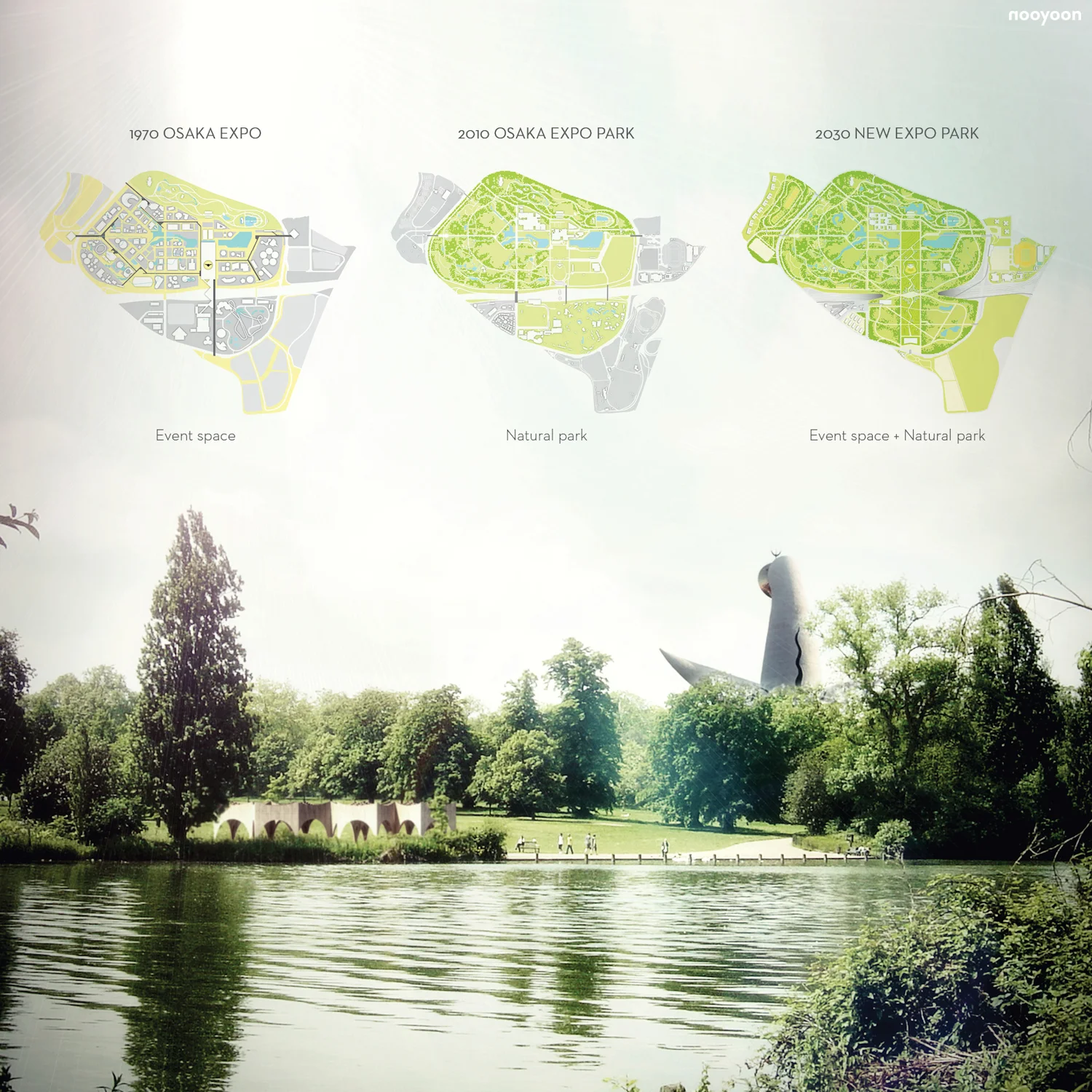 In 1970, the World EXPO was held in Osaka. This was the first world fair held in Japan and the most successful ever until Shanghai 2010. Kenzo Tange designed its master plan, and 12 other Japanese architects built projects within the total site of 330ha. After 1972, the site of the Osaka Expo became the “Expo Commemoration Park” and was managed both by the State and the Osaka Prefecture. All pavilions and historically important architectural monuments were demolished except some memorial buildings and monuments. Currently, the area contains a nature park of 985,000m2 with 600,000 trees. However, a new park needs new architectural intervention to enhance surrounding urban development. New Expo Park, which I am proposing, will be re-vitalized to approximate the original function of the 1970 EXPO. ‘Fairground’ event space will bring new prosperity to the park.