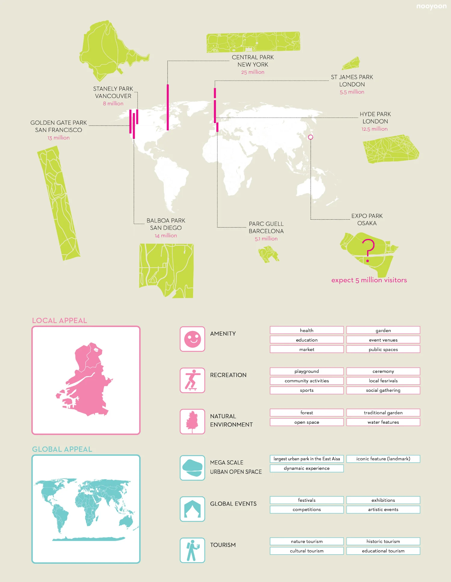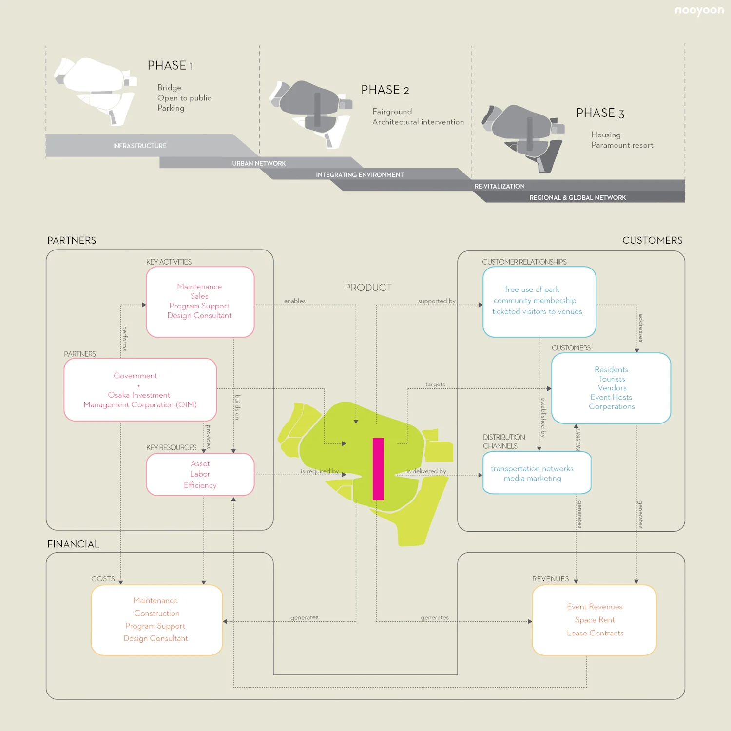 The project is phased so the park first benefits the local users and gradually forms a synergy with other recreational programs to attract global visitors. This is done by connecting existing fragments of public spaces and amenities surrounding the Expo Park with pedestrian bridges. The proposed main bridge between the northern Expo Park and the southern site consolidates two large bodies of land, creating a monumental public space that could accommodate large-scale events and spectacles that could draw in local and international visitors.