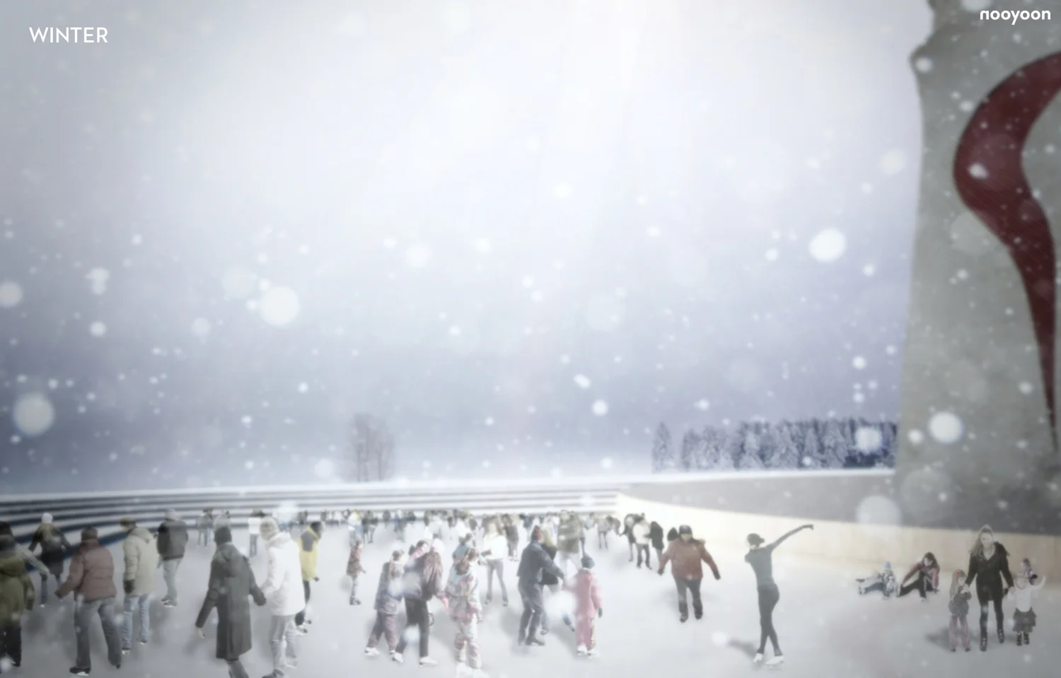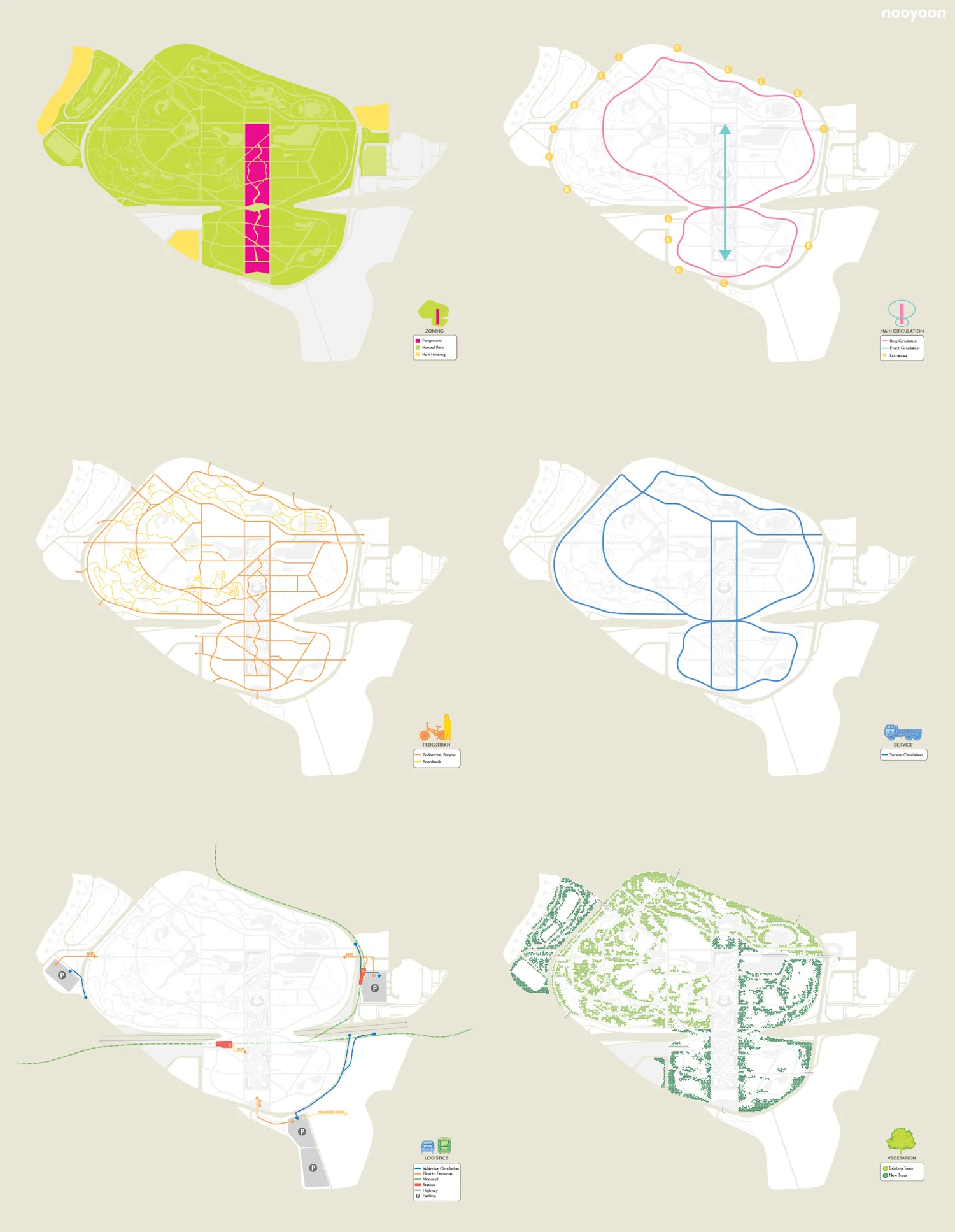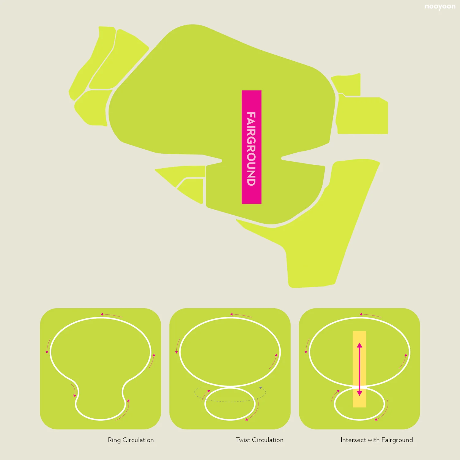 The key concept of our master plan is to revitalize the existing Expo Park to serve both local and global visitors. The Fairground with the pavilion cluster is the main architectural intervention. The Fairground frames the Sun Tower as a historic symbol of the area and holds diverse events in terms of scale and programs. The twisted circulation maximizes the function of Fairground and guides the concentration of visitors and events through the Fairground.