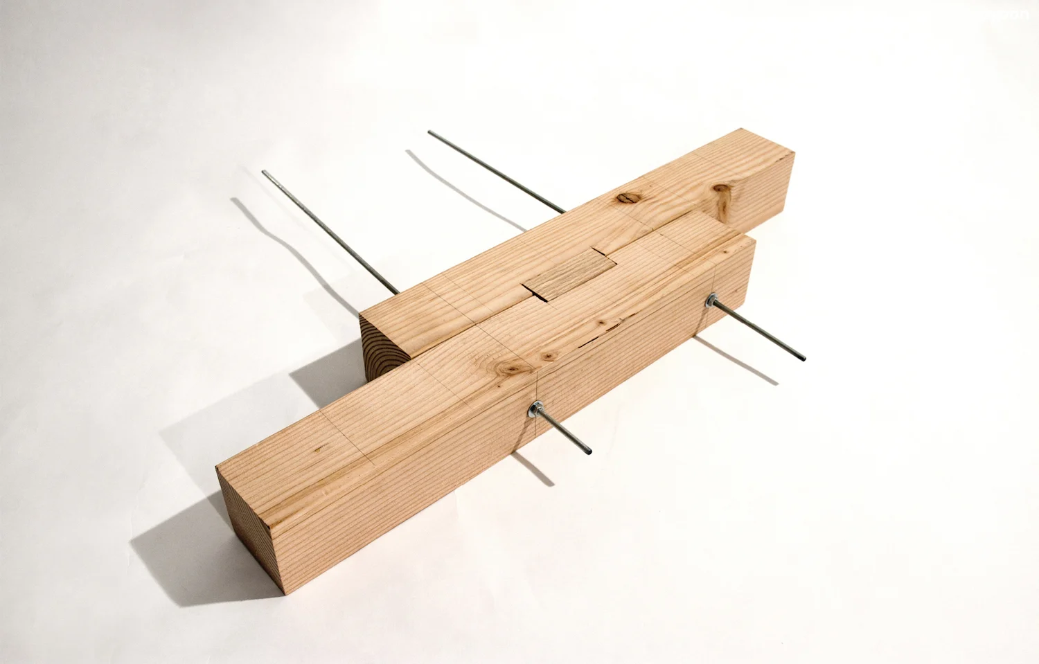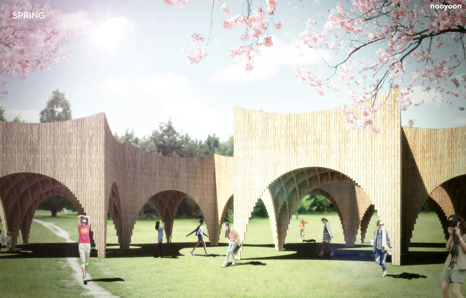 A pavilion is made of recycled timbers of 120x120mm. The timbers are joined by the pre-stressed cables. Two types of pins prevent vertical shear; a plane type for horizontal connection and a 3-dimensional type for cross joinery. Moreover, the pavilion is pre-fabricated at the factory and the nine pre-fabricated parts are assembled at the site.