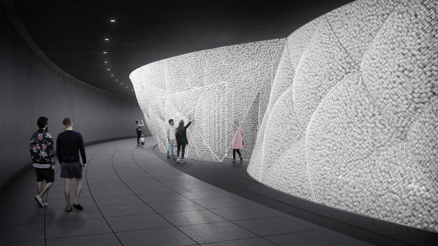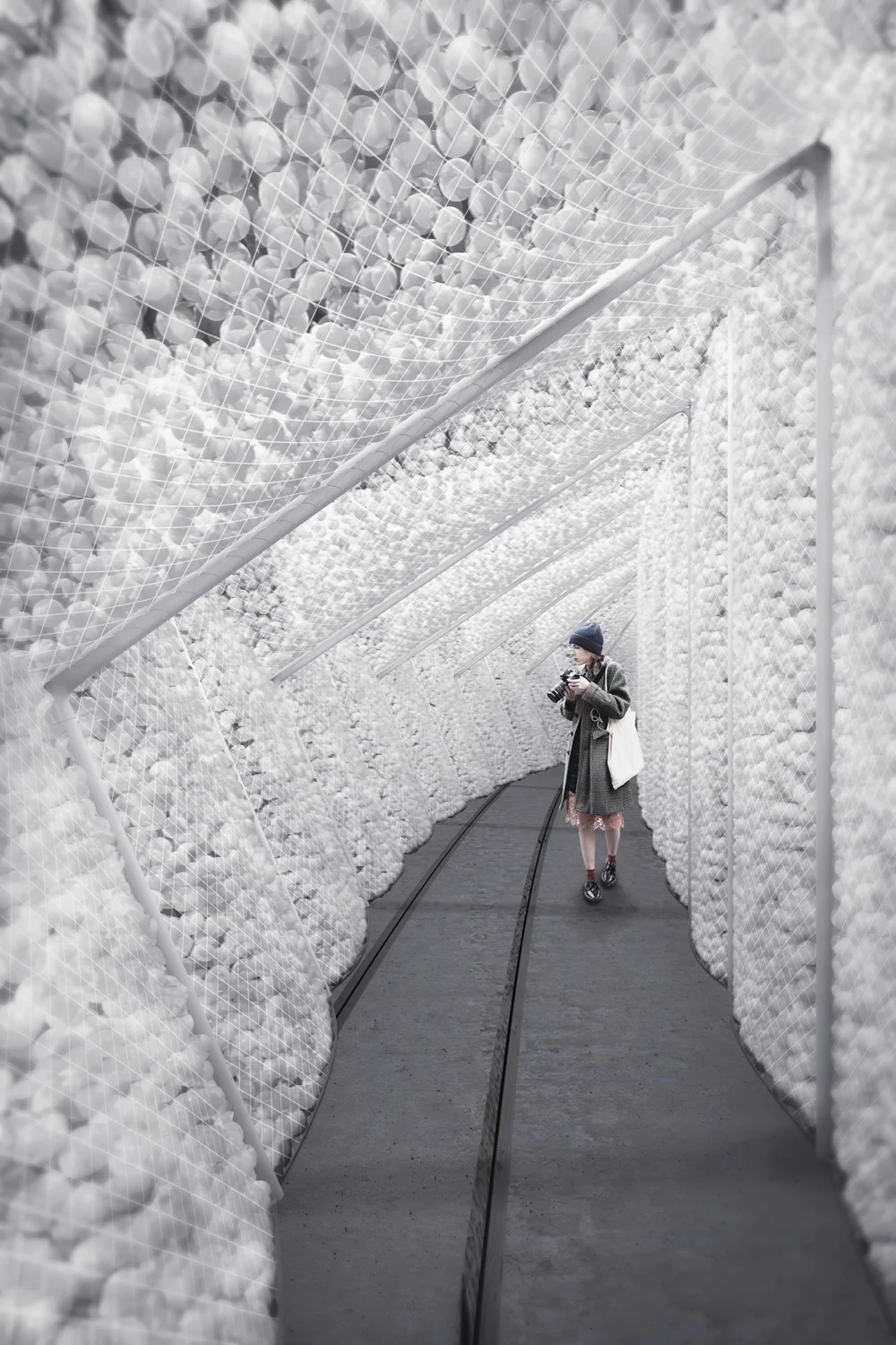 650,000 plastic balls will create a surreal midair environment in the Dupont Underground. Whimsical Invasion implicates a contradictory concept that is a passive and active spatial intrusion by the installation and visitors. The space will be invaded by the cloud and visitors will invade the cloud. The imagery and huge cloud will collide in the underground passage and invade the passage from somewhere outside. Visitors will be able to see, touch, and feel its movement from outside of the cloud. Visitors will create the movement by touching and pushing the cloud, both from the inside and outside. Minimum construction, such as nylon netting and steel pipe framing, will convert the dark underground space into a surreal immersive space.