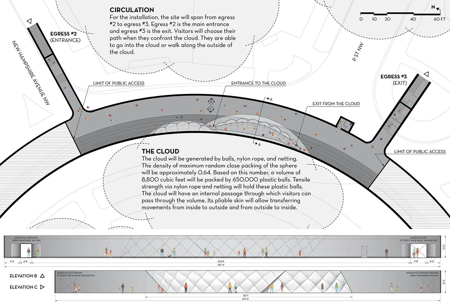 The cloud will be generated by balls, nylon rope, and netting. The density of maximum random close packing of the sphere will be approximately 0.64. Based on this number, a volume of 8,800 cubic feet will be packed by 650,000 plastic balls. Tensile strength via nylon rope and netting will hold these plastic balls. The cloud will have an internal passage through which visitors can pass through the volume. Its pliable skin will allow transferring movements from inside to outside and from outside to inside.